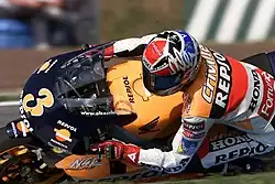 Initially he retired on the opening round in Malaysia and had only finished fourth in Indonesia whilst teammate Mick Doohan won the race. However, at the Japanese race, he took his first pole of the season on Saturday and finished second on Sunday.[13] In Spain however, he recorded his second retirement of the year. Initially taking the lead of the race from polesitter and teammate Doohan, as well as Luca Cadalora (who had a better start and thus led into turn one), Crivillé pulled a gap after a short battle with Cadalora, whose tyres began to fade. Crivillé then led for much of the race but Doohan was closing in at the final laps. On the last lap, spectators who already thought the race had ended, invaded the track around turn nine (the "Curva Àngel Nieto"), distracting Crivillé enough to allow Doohan to get back right on his tail going into the last couple of corners. Going into the last hairpin before the start-finish straight, Doohan went to the inside, going side-by-side with Crivillé. The pair did not touch, but Crivillé lost the rear whilst trying to accelerate, highsiding out of contention on the very last corner of the race, allowing Doohan to win the race as a result.[14][15][16]