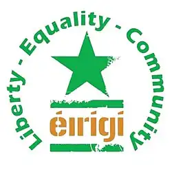 Éirígí (Irish pronunciation: [ˈeːɾʲiːɟiː]), officially Éirígí For A New Republic, is a socialist republican political party in Ireland.[3] The party name, Éirígí, means "Arise" or "Rise Up" in Irish, and is a reference to the slogan "The great only appear great because we are on our knees. Let us rise!" used by Irish socialists James Connolly and Jim Larkin.[4] Éirígí was formed in 2006 by a group of community and political activists who broke away from Sinn Féin, believing that party was not committed enough to socialism.[1]