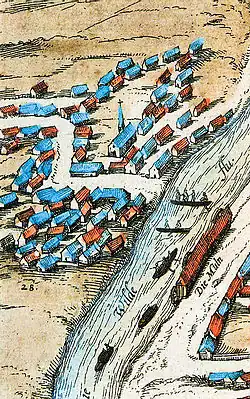 Žirmūnai's southernmost section, which lies on the bank of the River Neris opposite the Vilnius Castle Complex, was part of the settlement known as Žvejai; another part of that settlement is now located within the elderate of Šnipiškės. According to archaeological surveys from 2005, a fishing village may have been located here as early as the late 14th century, giving the area its name, literally, Fishermen; it was later settled by craftsmen and housed the Orthodox Church of St Barbara.[2] During the 16th century, the only glass factory in the Grand Duchy of Lithuania was located in the suburb of Žvejai.[14] In 1563, after the construction of the first bridge over the River Neris (at the approximate location of today's Mindaugas Bridge), the suburb of Žvejai became an integral part of the city of Vilnius.[14] During Tsarist rule in the 19th century, the name of Žvejai was superseded by that of Piramont, originating from the small estate of Piramont in the area (now Kalvarijų 1).[15] Piramontskij Alley can be seen in a 1904 map of Vilnius[16] where today's A. Juozapavičiaus Street in the elderate of Šnipiškės is located, close to the boundary of Žirmūnai. The usage of Piramont as a placename gradually became limited to the southern part of Žvejai.