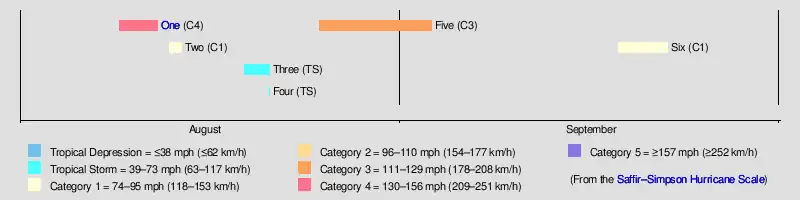 Five August 25 – September 3 Category 3 hurricane 115 (185) 969 Southeastern United States Unknown None