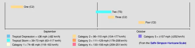 As the previous storm was moving along the coastline of the southeastern United States, a new hurricane was observed in the western Caribbean Sea, about halfway between Honduras and Jamaica. Its intensity, based on a ship report, was estimated at 105 mph (169 km/h). The hurricane moved slowly west-northwestward, and another ship experienced its strong winds on October 7. There were no further observations, so its complete track is unknown.[1][2]