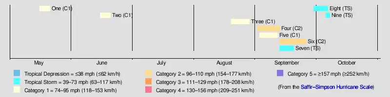 Six September 12–25 Category 2 hurricane 110 (175) 982 Lesser Antilles, Mexico (Quintana Roo), Southeastern United States