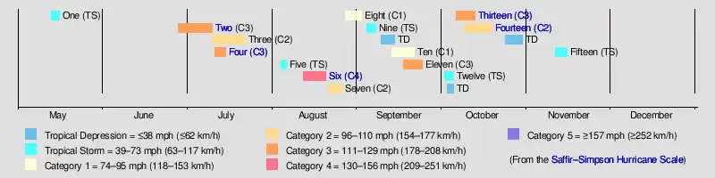 Tropical cyclogenesis began on May 13, when a tropical depression formed south of Cuba. The storm struck Cuba and Florida before becoming extratropical over Virginia on May 16. Following an almost month and a half lull in activity, the season's second tropical cyclone developed over the southwestern Caribbean Sea on June 28. The third and fourth cyclones, both reaching hurricane intensity, formed in July. The month of August featured four tropical cyclones, including a tropical storm and three hurricanes. One of those, the season's sixth tropical cyclone, became the most intensity system in the Atlantic basin in 1916 and peaked at Category 4 intensity on the modern-day Saffir–Simpson scale with maximum sustained winds of 130 mph (210 km/h).[2] In terms of barometric pressure, the storm was also the most intense to strike the United States since the 1886 Indianola hurricane.[3] Four tropical systems also developed in September, with one tropical depression,[4] one tropical storm, and two hurricanes.[2] October was the most active month of the season, featuring two tropical depressions,[4] one tropical storm, and two hurricanes. In November, a tropical storm developed on November 11 and transitioned into an extratropical cyclone by November 15, ending season activity.[2]