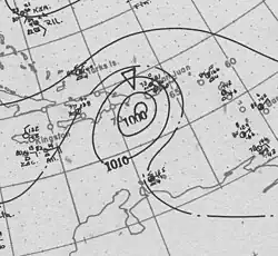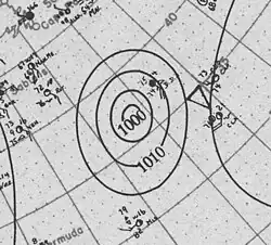 On September 17, the eleventh tropical storm was first detected about 950 mi (1,530 km) east of Barbados. It headed west-northward, strengthening into a hurricane on September 19, before passing well north of the Lesser Antilles. The storm became a Category 3 hurricane early on September 22,[2] and shortly thereafter peaked with maximum sustained winds of 120 mph (195 km/h) and a minimum barometric pressure of 975 mbar (28.8 inHg), based on data from ships and historical weather maps.[4] It turned northeastward and passed by Bermuda on September 24. The storm then weakened significantly and transitioned into an extratropical cyclone on the same day approximately 200 mi (320 km) southeast of Sable Island.[2] Another extratropical cyclone soon absorbed the remnants of this storm.[4]