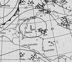 On August 27 at 12:00 UTC, a tropical storm was observed about 800 mi (1,285 km) east of Barbados. It strengthened into a hurricane about 12 hours later. The storm attained its peak intensity around the time it struck Dominica with maximum sustained winds of 80 mph (130 km/h) and a minimum barometric pressure of 986 mbar (29.1 inHg) early on August 28,[2] with the former being based on the latter, which was observed at Roseau.[4] This fast-moving hurricane tracked westward through the Caribbean and weakened to a tropical storm on August 30 while south of Haiti's Tiburon Peninsula. The cyclone weakened to winds of 45 mph (72 km/h) by the following day, but re-strengthened somewhat prior to its landfall in northern Belize with winds of 60 mph (97 km/h) on September 1. The storm moved west-southwestward into Guatemala and weakened, falling to tropical depression intensity on September 2 and dissipating shortly thereafter.[2]