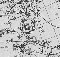 A tropical storm was first detected about 240 mi (385 km) northeast of the central Bahamas early on July 11. The storm moved west-northwestward and slowly intensified, and by 18:00 UTC on July 12, it became a hurricane. About 24 hours later, the cyclone turned northwestward and peaked as a Category 3 hurricane with maximum sustained winds of 115 mph (185 km/h). Weakening slightly to a Category 2 hurricane early on July 14, the cyclone made landfall in South Carolina between Charleston and McClellanville with winds of 110 mph (180 km/h) and a barometric pressure of 960 mbar (28 inHg),[2] the former based on observations from the ship Hector and latter being an estimate derived from weather records at Charleston.[4] The system weakened more quickly after moving inland, falling to tropical storm intensity several hours later as it resumed its original west-northwestward motion. Late on July 15, the storm weakened to a tropical depression over western North Carolina and promptly dissipated.[2]