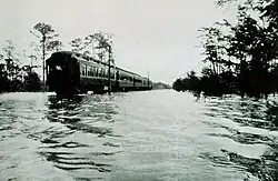 Days of downpours in the state flooded approximately 350,000 acres (140,000 ha) of land;[9] the most prolific freshwater flooding followed the Cahaba and Alabama rivers through Perry, Dallas, Wilcox, and Monroe counties, where collectively 250,000 acres (100,000 ha) of farmlands was inundated and $2.5 million worth of crops were destroyed,[22] contributing to an estimated statewide total of $5 million in lost crops. In the same area, at least 2,000 families were forced to evacuate their homes.[21] Residents along the Coosa River faced destitution and fears of famine, resulting in a rush to slaughter cattle for food.[21] For 170 mi (270 km) of its course, the Tombigbee River flooded 1.25 mi (2.01 km) of land on both sides.[9] Multiple people drowned in floodwaters in Birmingham and Tuscaloosa,[30] and in some communities, residents clung to treetops to escape raging floodwaters. In Birmingham, the flooding closed manufacturing plants.[31] Railways and train trestles were washed out or blocked by landslides,[13] with one railroad in particular, the Southern Railway, having service interrupted on a total 140 mi (230 km) of track, mostly south and west of Birmingham.[32]