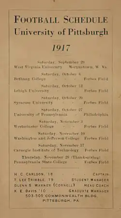 21. ^ "Pop Warner Forced to Rebuild Pitt's Football Machine". The Gazette Times. September 9, 1917. p. 19 – via Newspapers.com.