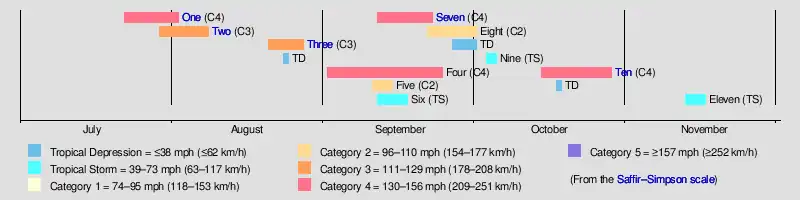 One July 22 – August 2 Category 4 hurricane 140 mph (230 km/h) 967 hPa (28.55 inHg) Lesser Antilles, Puerto Rico, Turks and Caicos Islands, The Bahamas, Northern Florida $16.4 million >287 [3][17][19]