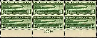 The Graf Zeppelin stamps of 1930 were issued in sheets of fifty. Each sheet had a "plate number" inscribed in the margin of the sheet.[3]