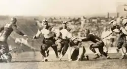 In front of a massive crowd of 33,000 fans, Texas won the toss and elected to kickoff. At the last second the Irish's star Back; George Melinkovich, switched positions with the newcomer but in his haste fumbled the return. Texas' Jack Gray captured the fumble at the Notre Dame 18. While Chevigny's gambit hadn't worked out the way it was planned the result was still the same and four plays later Bohn Hilliard followed guard Joe Smartt into the endzone for the touchdown and followed it up by kicking the extra point himself.[15] The remainder of the game was a defensive struggle whose only interruption came midway through the second quarter when Notre Dame was punting the ball from their 32. The ball stuck the ground at Buster Baebel's, the Texas Quarterback, feet and while he picked it up he was rocked by a tackle from John Michuta, ND Tackle, and the ball flew out of his hands and was recoved by Notre Dame on the Texas 9 yard line. On fourth & one from the goal line Melinkovich crashed over the line for what would've been the game tying touchdown, however Wayne Millner missed the ensuing extra point leaving Texas ahead 7-6. Halftime saw a dedication to the memory of Johnny Young, the ND halfback who had died that summer in Houston, Texas. Following halftime neither team found the end zone again but not due to lack of cohesion, the game was characterized by hard-hitting and fast running throughout.[3]