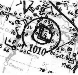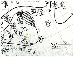 The final cyclone of the 1938 season developed by 06:00 UTC on November 7 off the northern coast of Haiti.[6] In its early stages, the system exhibited a broad radius of maximum winds and was in close proximity to a stationary front, suggesting it was a subtropical storm for most of its duration. High pressure to the north directed the cyclone northwest, and it made landfall on Inagua in the Bahamas with winds of 70 mph (115 km/h) at 11:00 UTC on November 7; these winds were located well north of the center. It made a second landfall eight hours later on Crooked Island at an unchanged strength. The storm began to weaken early on November 8 and curved southwestward later that day, bringing it ashore the central coastline of Cuba with winds of 50 mph (80 km/h) around 06:00 UTC on November 9.[5] The system continued into the northwestern Caribbean Sea, where it merged with a former frontal boundary and dissipated after 18:00 UTC on November 10.[5][6]