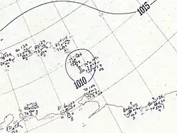The final Atlantic hurricane of 1945 was not officially documented until over a decade following the end of the season. Using re-analyzed surface weather maps, as well as recounts from local residents along the storm's path, it was discovered that a tropical depression formed south of Jamaica in the southwestern Caribbean Sea by 12:00 UTC on October 10.[2][22] The compact storm moved north and then north-northeast ahead of a stationary front that existed from the western Atlantic into the Bay of Campeche. It became a minimal hurricane over the Cayman Islands by 00:00 UTC on October 12 and attained its peak at Category 2 intensity with winds of 100 mph (160 km/h) while making landfall along a deserted southern stretch of Cuba. The storm emerged into the Bahamas while maintaining Category 1 strength before becoming intertwined with the frontal zone and transitioning into an extratropical cyclone southwest of Bermuda.[22] The post-tropical storm slowly weakened but persisted until it was absorbed by a large extratropical low near the Azores on October 16.[2]
