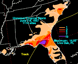 3. ^ a b Roth, David M.; Weather Prediction Center. "Unnamed Tropical Storm – June 7–9, 1957". Tropical Cyclone Point Maxima. United States National Oceanic and Atmospheric Administration's National Weather Service. Retrieved February 28, 2013.