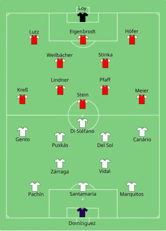 Widely regarded as one of the greatest football matches ever played, Real Madrid won 7–3 in front of a record crowd of over 127,000 people. Real Madrid players Alfredo Di Stéfano (3) and Ferenc Puskás (4) both scored hat-tricks in the final.