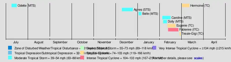 Agnes existed from December 9 to December 24. Rainbands from Agnes affected Réunion while the storm passed to the north.[1]