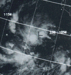 Eleanor was a short-lived, weak tropical storm that stayed well out to sea. On July 7, a tropical depression formed east-southeast of the weakening Carlotta and west of the strengthening Denise. By July 8, satellite imagery showed that the depression had strengthened into a tropical storm. Eleanor strengthened over the next 24 hours to a top strength of 60 mph (97 km/h). On July 10, a U.S. Air Force weather reconnaissance plane found a weakening system and the next day the storm was a dissipating depression moving toward the west-southwest.