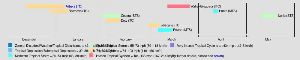 The first named storm of the season, Alibera formed on December 16, well to the northeast of Madagascar. For several days, it meandered southwestward while gradually intensifying. On December 20, Alibera intensified to tropical cyclone status with 10‑minute winds of 120 km/h (75 mph), or the equivalent of a minimal hurricane. That day, the Joint Typhoon Warning Center (JTWC), an unofficial warning agency for the region, estimated peak 1‑minute winds of 250 km/h (160 mph), while the Météo-France office in Réunion (MFR) estimated 10‑minute winds of only 140 km/h (87 mph). After drifting erratically for several days, the storm began a steady southwest motion on December 29 as a greatly weakened system. On January 1, Alibera struck southeastern Madagascar near Mananjary, having re-intensified to just below tropical cyclone status. It weakened over land but again restrengthened upon reaching open waters on January 3. The storm shifted directions while moving generally southward, dissipating on January 5.[2][9] It was the second longest-lasting tropical cyclone in the basin since the start of satellite imagery, with a duration of 22 days. Only Cyclone Georgette in 1968 lasted longer at 24 days.[10]