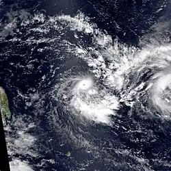 On January 31, a tropical disturbance formed just east of Agaléga. Moving southeastward, it intensified into Moderate Tropical Storm Cezera on February 1,[17] the same day that the JTWC began tracking it as Tropical Cyclone 14S.[2] Cezera quickly intensified, and the JTWC upgraded it to the equivalence of a minimal hurricane on February 3 with 1‑minute peak winds of 150 km/h (93 mph). By contrast, the MFR only estimated peak 10‑minute winds of 95 km/h (59 mph).[17] By February 4, Cezera began a Fujiwhara interaction with Tropical Cyclone Dety, which was located to the east; this caused the former storm to turn back to the northwest while gradually weakening.[17][18] On February 6, the storm turned to the south and later southeast, weakening to tropical depression status that day. Cezera briefly re-intensified into a moderate tropical storm on February 7, but weakened again on the next day while passing just north of St. Brandon. After turning more to the east-northeast, the system turned sharply southward on February 10, and dissipated the next day.[17]