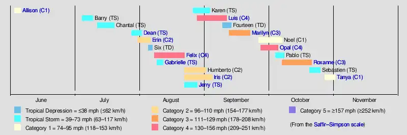 Hurricane TanyaHurricane RoxanneHurricane OpalHurricane MarilynHurricane LuisTropical Storm Jerry (1995)Hurricane Iris (1995)Tropical Storm Gabrielle (1995)Hurricane Felix (1995)Hurricane Erin (1995)Tropical Storm Dean (1995)Hurricane Allison (1995)Saffir-Simpson Hurricane Scale