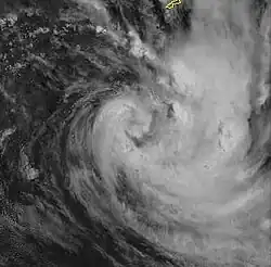On February 23, a depression formed near the Southern Cook Islands and gradually developed further over the next couple of days, as it moved south-westwards over the open seas.[18] On February 25, the system moved into MetService's area of responsibility where it started to bear the hallmarks of a tropical cyclone and thus MetService discussed the possibility of naming the system with the FMS.[18] At the time there was no precedent of a tropical cyclone being named in the South Pacific while located to the south of 25°S and nobody knew if MetService should take a name from the FMS list of names for the region or make one up.[18] As a result, it was decided to treat the system as a depression operationally, before it was classified as an unnamed tropical cyclone in post-analysis.[18] At around 15:00 UTC+12 (03:00 UTC) on February 26, visible satellite imagery showed that the system had developed a ragged eye, which suggested that the system was at or near hurricane strength.[18] 3 hours later, the "Capitaine Tasman" encountered the system and recorded 10-minute sustained winds of 110 km/h (70 mph) near the centre, which made it a category 2 tropical cyclone on the Australian Scale.[18] Later that day, the NPMOC initiated advisories on the system, designated it as Tropical Cyclone 29P and estimated peak 1-minute sustained windspeeds of 85 km/h (50 mph).[7]