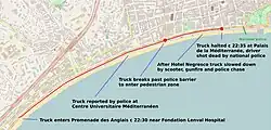 - c. 22:30 – Lahouaiej-Bouhlel drove the truck eastward onto Promenade des Anglais near the Fondation Lenval Children's Hospital.[23][34][35][36]