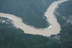 The Kuma River overran its bank in eleven different locations and breached one levee.[15] In Kuma, Kumamoto, stranded residents were rescued by a rescue helicopter.[14] Eight homes were swept away in Ashikita, Kumamoto.[8] In Tsunagi, Kumamoto, 2–3 people were pulled out of a landslide without signs of life.[14] Some 8,000 homes were left without power in Kumamoto and Kagoshima according to the Kyushu Electric Power Company.[14] Another 6,100 houses were estimated to be submerged, 11 bridges destroyed[16] and 4,700 buildings destroyed, damaged or flooded.[3]