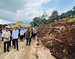 President Joko Widodo directed the minister of public works and housing, Basuki Hadimuljono, to survey the damage. Basuki arrived in Cianjur Regency on 21 November at 21:45.[97] According to President Widodo, residents whose homes were heavily and moderately damaged would receive Rp 50 million and Rp 25 million in assistance, respectively. Rp 10 million would be given to homes with light damage.[98] The BMKG urged residents to be wary of potential flash floods and rain due to unstable slopes. The agency's head, Dwikorita Karnawati, stated that materials on unstable slopes could be washed away, triggering floods and landslides. Residents were also advised not to visit slopes and riverbanks due to the risk of flash floods.[99]
