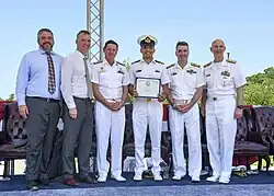 One of the first three Royal Australian Navy officers to graduate from the US Navy's Nuclear Power School posing with Australian and American dignitaries in July 2023