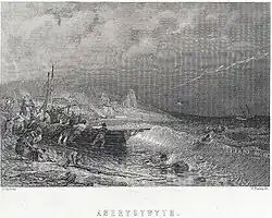 People pulling a boat ashore in a stormy sea, print by William Radclyffe from the collection of the National Library of Wales