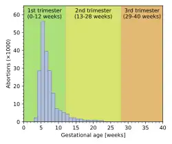 The Guttmacher Institute estimated there were 2,200 intact dilation and extraction procedures in the US during 2000; this accounts for <0.2% of the total number of abortions performed that year.[166] Similarly, in England and Wales in 2006, 89% of terminations occurred at or under 12 weeks, 9% between 13 and 19 weeks, and 2% at or over 20 weeks. 64% of those reported were by vacuum aspiration, 6% by D&E, and 30% were medical.[167] There are more second trimester abortions in developing countries such as China, India and Vietnam than in developed countries.[168]