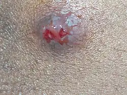 Five-day-old inflamed epidermal inclusion cyst. The black spot is a keratin plug that connects with the underlying cyst.