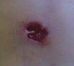 An abscess is a collection of pus that has built up within the tissue of the body, usually caused by bacterial infection.[6][7] Signs and symptoms of abscesses include redness, pain, warmth, and swelling.[1] The swelling may feel fluid-filled when pressed.[1] The area of redness often extends beyond the swelling.[8] Carbuncles and boils are types of abscess that often involve hair follicles, with carbuncles being larger.[9] A cyst is related to an abscess, but it contains a material other than pus, and a cyst has a clearly defined wall. Abscesses can also form internally on internal organs and after surgery.
