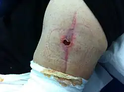 An incisional abscess develops as a complication secondary to a surgical incision. It presents as redness and warmth at the margins of the incision with purulent drainage from it.[26] If the diagnosis is uncertain, the wound should be aspirated with a needle, with aspiration of pus confirming the diagnosis and availing for Gram stain and bacterial culture.[26]