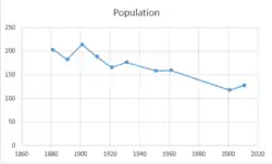 Between 1881 and 2001 the population fluctuated, but reduced from 204 to 118. Census data shows a peak population of 215 in 1901. Since 2001, with its lowest point of 118 residents, the population rose, and by 2011 was 128.[2]