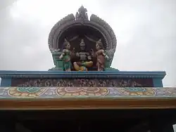 Next to Artha mandapa close to the Maha mandapa are the twin Ganesha (Shiva's son) icons. Goddess Mariamman and Pradosha Nayakar Thirumeni are on the right.[1] Next to it is the east-facing sanctum dedicated to Shiva as Akshayapureeswarar, who is worshipped as a linga.[1][2] Narthana Vinayaka (dancing Ganesha), Dakshinamurti (Shiva as a teacher), the god Brahma, the goddess Durga and the goddess Gajalakshmi are worshipped in the Deva kottam.[1] Other aspects of Shiva like Bhairava, Lingodbhava and Nataraja are worshipped. The temple has shrines dedicated to Shiva's son Murugan (Kartikeya) with his consorts Devayanai and Valli, the saint Chandeshvara, Shiva's bull mount Nandi, and the serpent deity Naga.[1][2] Ganesha is worshipped as Vijaya Vinayaka in a temple opposite the main temple and said to bestow success.[1][2]