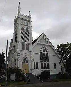 The Monteith district contains a number of churches. A former United Presbyterian Church, now known as "Whitespires", is located at the corner of Washington and Fifth. It was built in 1891 and is noted for its stained glass windows and Carpenter Gothic details. Its spire is the highest point in Albany.[4]