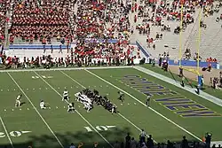 The XFL's second incarnation used a five-round shootout of two-point conversions similar to a penalty shootout in soccer or ice hockey. The current UFL also uses the XFL's overtime system, albeit reduced to best-of-three. Such a shootout had never been attempted in organized football at the time the rule was proposed; in April 2019, the NCAA adopted a similar concept for games that reach quintuple overtime, starting with the 2019 FBS season, two seasons later, triple overtime.[15][16] The defense is not able to score, as should a turnover occur, the play would be dead.[17] Defensive penalties result in the ball moving up to the 1-yard line, while a second defensive penalty on any play, even in future rounds, results in a score awarded to the offensive team. To speed up the overtime process, both teams' offense and defense are on the field at the appropriate end zone. Once one team's offense has completed its round of the shootout, the other team's offense plays its round from the opposite end zone.[18] These overtime rules ensure that both teams have an opportunity to win the game and would limit overtime to 5 or 6 minutes. If both teams remain tied after five rounds, multiple rounds of conversions will be played until one team succeeds, thus ensuring that no game can end in a draw.[17]