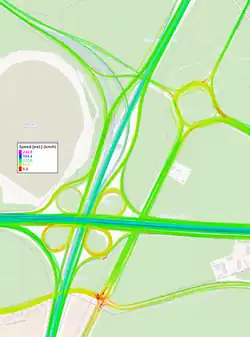 Except at construction sites, the general speed limits, where they apply, are usually between 100 km/h (62 mph) and 130 km/h (81 mph); construction sites usually have a speed limit of 80 km/h (50 mph) but the limit may be as low as 60 km/h (37 mph).[42] In rare cases, sections may have limits of 40 km/h (25 mph),[43] or on one ramp 30 km/h (19 mph).[44] Certain stretches have lower speed limits during wet weather. Some areas have a speed limit of 120 km/h (75 mph) in order to reduce noise pollution during overnight hours (usually 10 pm – 6 am) or because of increased traffic during daytime (6 am – 8 pm).