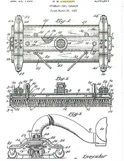 In 1883 John E. Pattison of New Orleans applied for a "Cistern and Tank Cleaner" and the first discovered patent was issued the following year.[1] It swept and scraped the bottom of a cistern or tank and, through a combination of suction and manipulation of the water pressure, was able to separate and remove sediment without removing the water. Over the next 20 years his invention was revised multiple times. Many pool cleaner patents issued in the modern era refer to some of the cistern cleaners as predecessors of their invention.