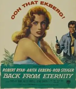 Back from Eternity is a 1956 American drama film about a planeload of people stranded in the South American jungle and subsequently menaced by headhunters. The film stars Robert Ryan, Rod Steiger, Anita Ekberg and Gene Barry. The film is a remake of the 1939 film Five Came Back, also directed and produced by John Farrow. Richard Carroll, who is credited with writing the story for Back from Eternity, wrote the original story for Five Came Back.