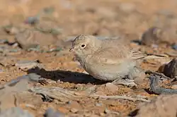 The bar-tailed lark was originally placed in the genus Melanocorypha.[2] Alternate names for the bar-tailed lark include: bar-tailed finch-lark, black-tailed desert lark, black-tailed lark, and black-tailed sand lark.