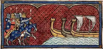 The English fleet returned to England with the seized ships and a large booty; a contemporary writer claimed "never had so much treasure come into England since the days of King Arthur".[22] The success at Damme dashed any French hopes of invading England that year and severely strained their resources, but did little to affect their army or its operations. Nevertheless, John began preparing for an invasion of France and a reconquest of his lost provinces. The English barons were initially unenthusiastic about the expedition, which delayed his departure, so it was not until February 1214 that he landed in France. John was to advance from the Loire, while his ally Otto made a simultaneous attack from Flanders, together with Ferdinand. John retook the county of Anjou, but was forced back after losing the Siege of Roche-au-Moine to Philip's son, Louis, on 2 July.[23] Shortly after, Philip decisively defeated Otto and Ferdinand's army, which had assembled in the Low Countries, at the Battle of Bouvines. This ended John's hopes of regaining his continental lands.[4][20]