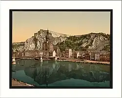 In 1914, the town had a population of 7,000 people and was an important strategic crossing on the Meuse, where the river flows through a south–north gorge. Three roads and a path converged on the town from the east, over an escarpment and down into the town, along which an attack from the east would come. The wooded ridge on the east bank was topped by the Napoleonic era stone Citadel of Dinant overlooking the town and the Meuse bridge, 100 m (330 ft) below.[1] In 1914 there was a ribbon of streets about 4 km (2.5 mi) long on the east bank, a few hundred metres wide.[2] Before the battle, the Mayor of Dinant urged the population to not take part in the fighting and forbade manifestations in support of the Allies.[3]
