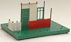 Bayko was primarily intended for the construction of model buildings. The rectangular Bakelite bases had a square grid of holes, spaced at 3/8 inch centres, into which thin metal rods, 75 thou [1.9 mm] in diameter, of various lengths, could be placed vertically. In order to make larger models, two or more bases could be joined together by means of metal links secured by screws through holes in the bases. Bakelite bricks, windows and other parts could then be slotted between pairs of rods in order to create the walls of the building. Other commonly used parts included floors (thin sheets of resin bonded paper with the same square pattern grid of holes as bases), and roofs of various types. There were also a large number of other more specialised parts.[4] In the original sets bases were large, and coloured brown; walls were brown/maroon and cream; roofs were deep maroon; and windows were a very dark green, but by 1937 the 'true' colours of red or white walls, green windows and red roofs were established, though bases were still large and brown.