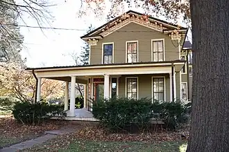 The Billingsley-Hills House, also known as the Veatch Residence, is a historic building located in Iowa City, Iowa, United States. This is one of several transitional Greek Revival to Italianate houses built in this area in the years before and after the American Civil War making it a very popular style here.[2] Over the years, however, most of them have either been torn down or altered beyond recognition leaving this house as one of few left with its integrity intact. When this house was built in 1870 it was situated on a 38-acre (15 ha) estate, but by the turn of the 20th century the lot was reduced to its present size. Situated in a residential area with the University of Iowa Hospitals and Clinics across the street, the two-story frame house features a low pitched gable roof, bracketed eaves, an entablature with dentils and returns, and a wrap-around front porch.