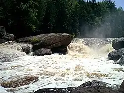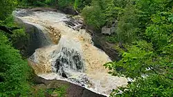 Great Conglomerate Falls is the southernmost (the Black River flows north) of the more publicized falls and the first large waterfall on the river's approach to Lake Superior. The river drops 30 feet (9.1 m) around a large piece of conglomerate rock, boulders and tree trunks into a deep gorge. Potawatomi Falls drops nearly 40 feet (12 m) in two sections around a piece of conglomerate rock, similar to Great Conglomerate Falls.