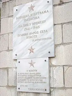 Bobota was the first village in Vukovar region where Yugoslav Partisans resistance was organized during the World War II in Yugoslavia.[14] In the Vukovar area, Ustaša authorities did not immediately launch large-scale killings against Serb communities in the first mass killing phase from April to May 1941 which targeted area that lacked significant economic value.[15] Wealthier regions such as Vukovar saw a more restrained approach, as peace and order were crucial for the continuity of industry and agriculture.[16] Mass shootings in town began in late July 1941 after the first act of resistance in Bobota.[16] The following day, the Ustaša forces encircled the village, interrogated and terrorized the inhabitants, and arrested 45 people.[17] Thirty of them were sent to the Jadovno concentration camp, while 15 were sentenced to death by a hastily convened traveling summary court and execution being carried at the Dudik site.[17] Over 500 people will be executed at the site during the war with the place being turned into the Dudik Memorial Park subsequently.[17] On 26 August 1941 local Ustaše representative was attacked under the leadership of Đoko Patković.[14] Represion led to further resistance and imprisonment of 500 residents of Bobota, Trpinja and Vera in September of 1941.[17] 96 residents of Bobota lost they lives during the World War II resulting in post-war reputation of the village as a regional stronghold of the resistance movement.[14] In the first years following the World War II in Yugoslavia and before 1948 Tito–Stalin split the new Yugoslavia implemented a number of policies copied from the Soviet Union including some aspects of collectivization in the Soviet Union. Rural resistance to this policy led to an incident in Bobota in 1945 when an anonymous humorous graffiti appeared in the village subsequently described by new authorities as an "enemy act by kulak elements".[18] The inscription, which rhyme in original language, stated "Kralju Petre, dođi nam do žetve, jer nam Tito odnese sve žito" or in English "King Peter, come before our harvest, because Tito took away all of our grain".[18] During the existence of the SFR Yugoslavia Bobota, nevertheless, gained reputation of comparatively prosperous village.[14]