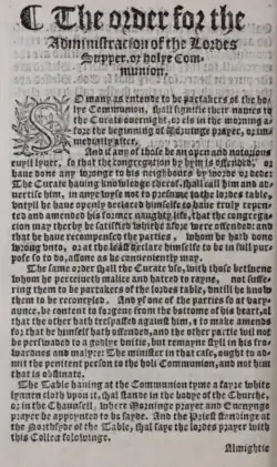 The office's title, The Order of the Administration of the Lord's Supper or Holy Communion, was the same as the 1552 prayer book and retained through the 1662 prayer book. A rubric detailing the place where a priest should stand during the office from the 1552 prayer book was retained within both the Elizabethan Act of Uniformity and 1559 text, though Elizabeth almost immediately abrogated it.[77] During the administration, two sentences from the preceding prayer books were, as Mark Chapman described, "somewhat incoherently combined" to form the following passage: