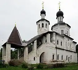 Prior to the construction of its own church at Borodino, people from the area were parishioners of the church of the Exaltation of the Holy Cross, which was on the other side of the Kolocha River at the confluence of the Stonets and Prudki creeks.[6] This church with a chapel (the lower church) in honour of St. Nicholas, Archbishop of Myra was destroyed in the Time of Troubles, probably in 1609. After that, the locals were parishioners in the church of the Assumption in the village Semenov also having a lower chapel of St. Nicholas.[6] There is no further history of this church following the middle of the 17th century.